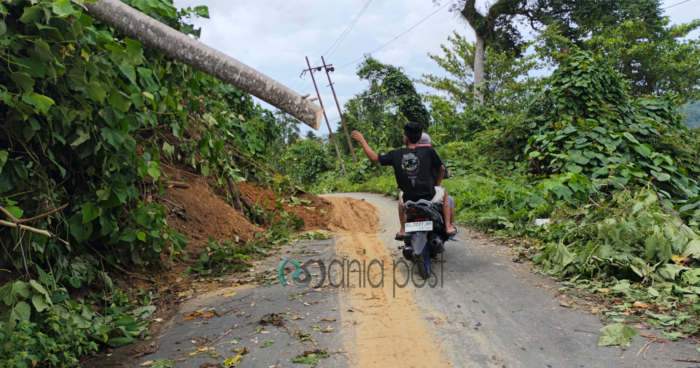 Tak hanya itu, sebuah pohon besar yang baru saja tumbang dari tebing di sisi jalan juga melintang di jalur tersebut. Meskipun kondisi sangat berbahaya, terlihat seorang pengendara sepeda motor dengan boncengan nekat mencoba melintas, perlahan-lahan merayap di sela-sela lumpur dan di bawah ancaman tiang yang miring. Aksi nekat ini mencerminkan keterisolasian warga yang sangat membutuhkan akses.